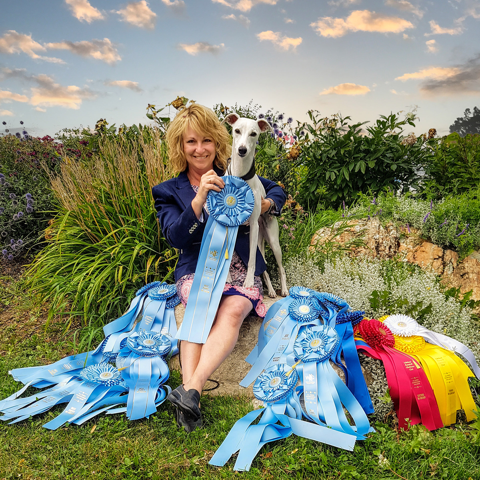 In Cranbrook celebrating the last day of Opal's puppy year with a pile of her ribbons.